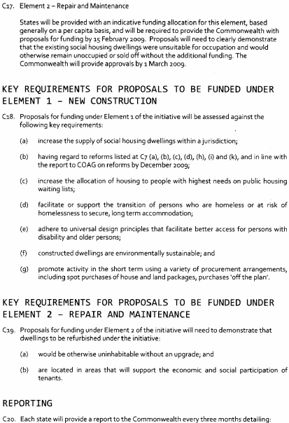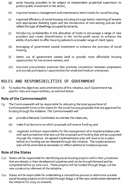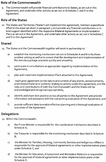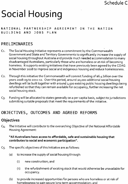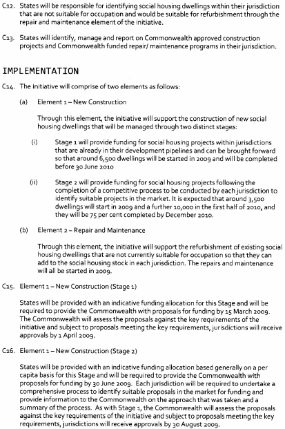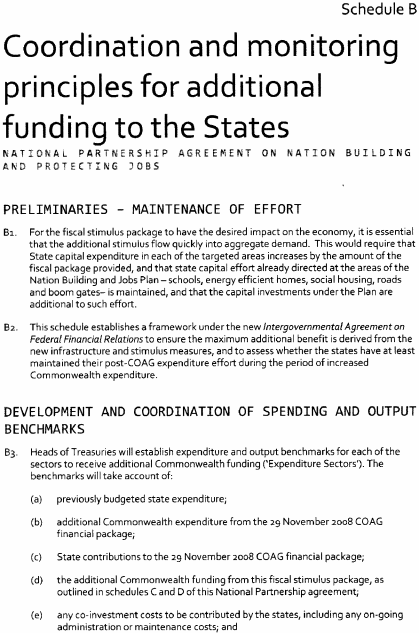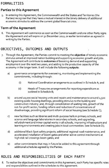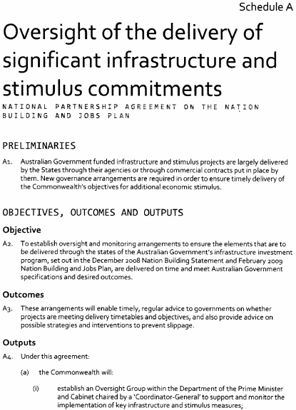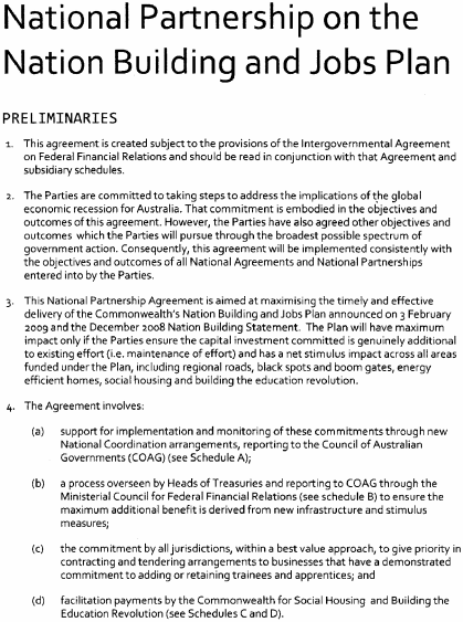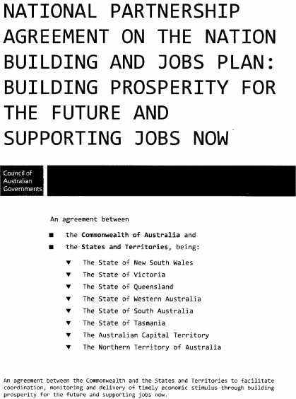 (a) on 5 February 2009 the Commonwealth and the various States and Territories entered into an agreement called the "National Partnership Agreement on the Nation Building and Jobs Plan: Building Prosperity for the Future and Supporting Jobs Now"; and(b) the main object of the agreement is to provide an economic stimulus to Australia's economy through infrastructure projects that will support economic growth and employment as part of a national response to the current global financial crisis; and(c) Tasmania is obligated under the agreement to ensure, and remove impediments to, its timely and effective implementation in and for this State: