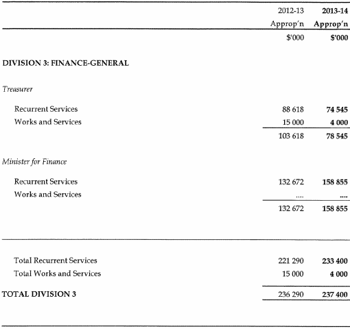 (1) In respect of the financial year ending on 30 June 2014, the Treasurer may (a) issue the sum of $3 465 320 000 out of the Consolidated Fund; and(b) apply that sum for the services of the Government.(2) The sum specified in subsection (1) is appropriated.