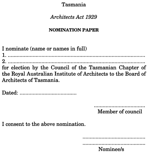 (1) Any member of the council may nominate up to 2 practising architects for election to the Board by (a) completing a nomination paper; and(b) delivering or sending it to the secretary.(2) The secretary is to refuse to accept any nomination paper that (a) is received less than 10 days before election day; or(b) does not contain the written consent of any nominee.