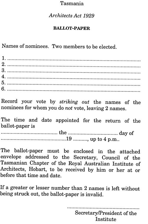 A member of the council may vote at an election by (a) striking out the names of all but 2 nominees on the ballot-paper; and(b) placing the ballot-paper in the envelope provided; and(c) delivering or sending the ballot-paper to the secretary.