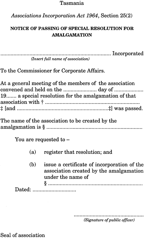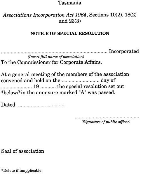 (1) A notice under section 23(3) of the Act of the passing of a special resolution is to be in accordance with Form 2 .(2) A notice under section 25(2) of the Act of the passing of a special resolution is to be (a) in accordance with Form 5 ; and(b) signed by the public officer of the association; and(c) sealed with the seal of the association; and(d) lodged with the Commissioner within one month after the date of the meeting at which the special resolution to which it relates was passed.
