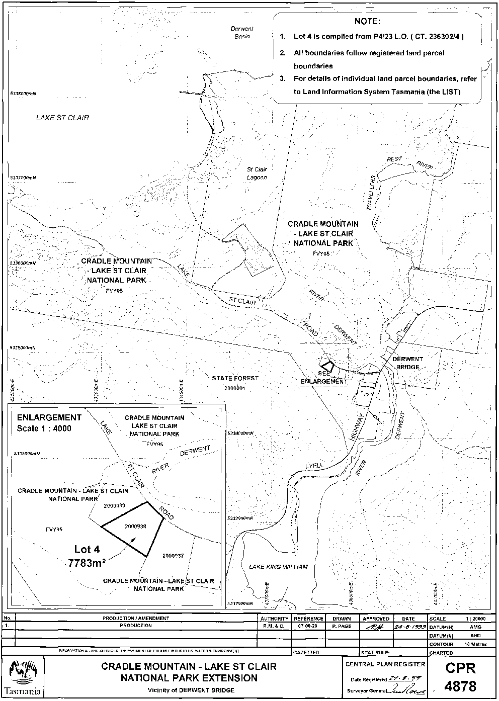 SCHEDULE 1 - Cradle Mountain-Lake St Clair National ParkAll that area of land comprising about 7 783 square metres shown bounded by a heavy black line on Plan Number 4878 in the Central Plan Register, a reduced copy of which is set out, by way of illustration only, in Schedule 2 to this proclamation.