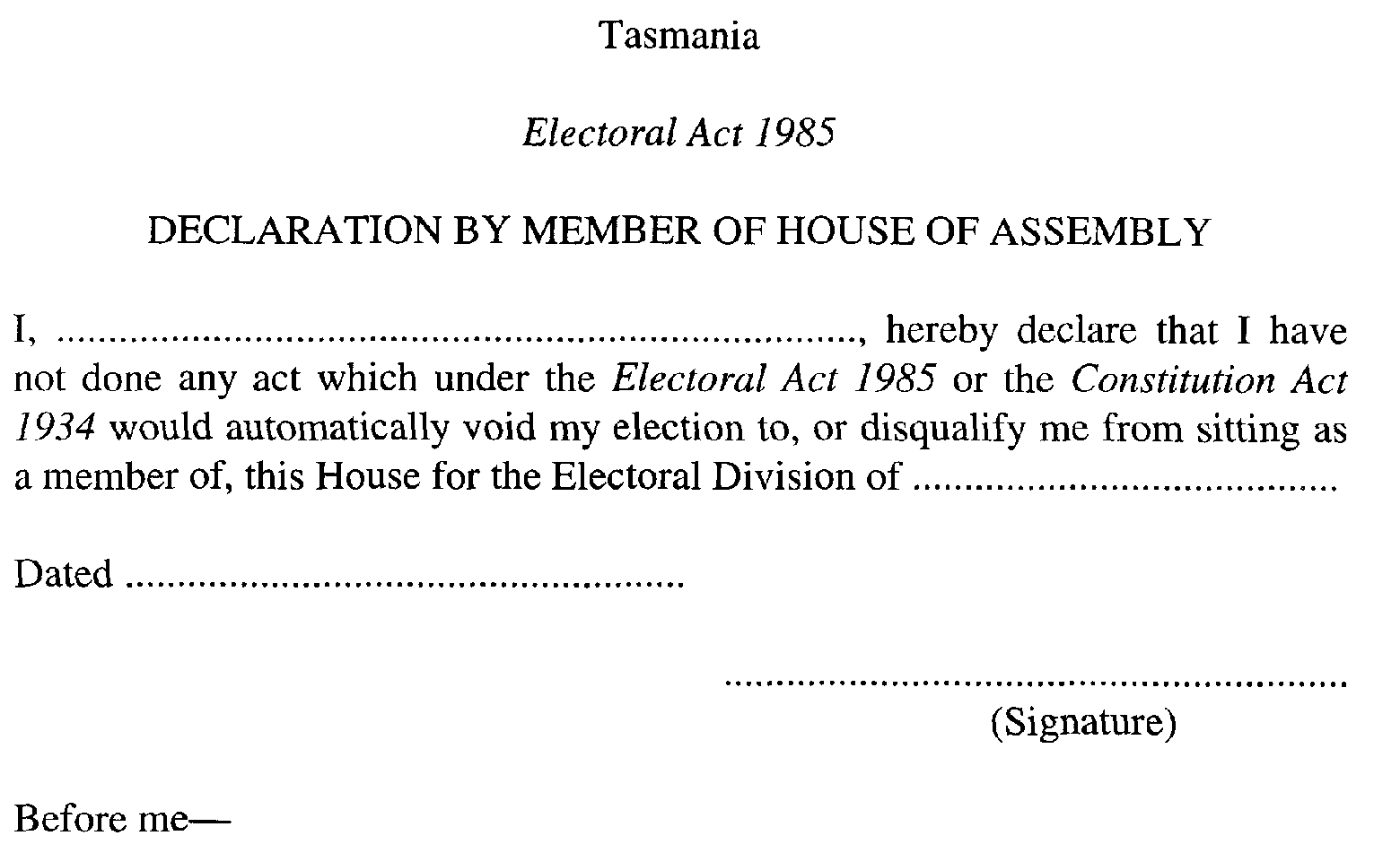 These regulations amend the Electoral Regulations 1985 by prescribing new declarations to be made by persons returned as members of the House of Assembly or Legislative Council.
