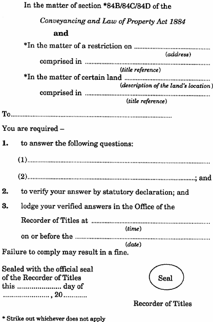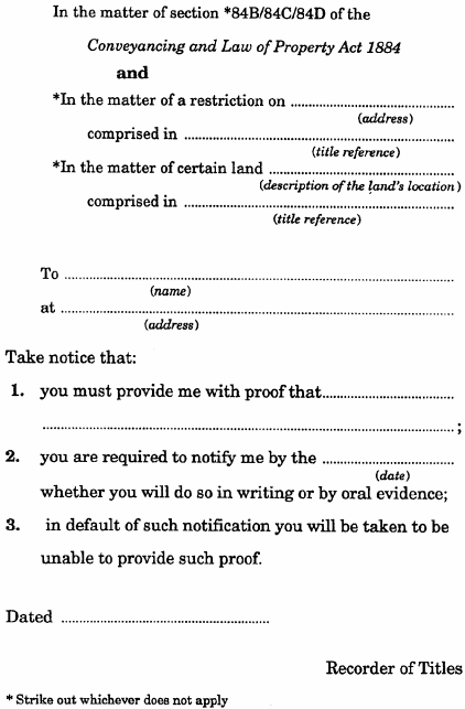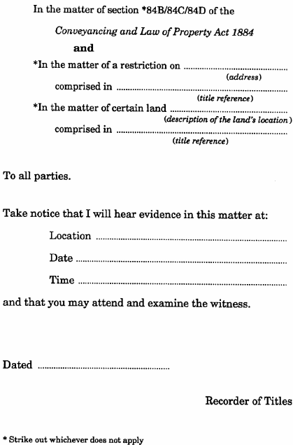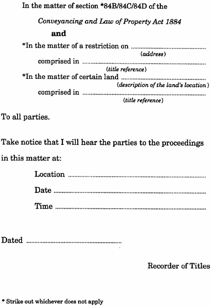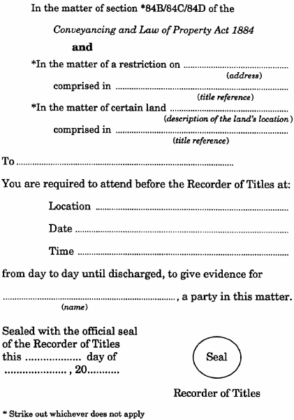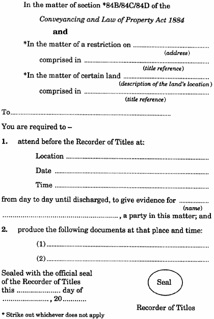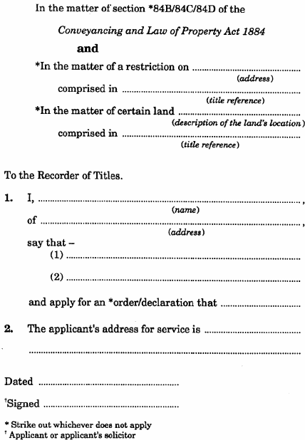 (1) In these regulations Act means the Conveyancing and Law of Property Act 1884;application means an application under section 84B , 84C or 84D of the Act;lodge means lodge with the Recorder;Recorder means the Recorder of Titles;seal means seal with the Recorder's seal of office.(2) In these regulations, a reference to a form by number is a reference to the form of that number in Schedule 1 .