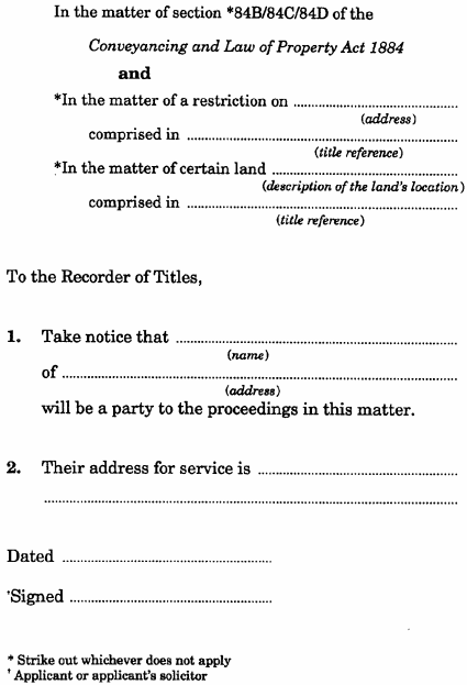 (1) A person who proposes to become a party to the proceedings on an application may, at the times specified in regulation 9 of the Land Titles Regulations 2002 , inspect the application and all other information lodged in respect of the matter.(2) To become a party to the proceedings on the application, a person must lodge a notice in accordance with Form 2 within (a) if notice of the application was given by way of an advertisement under section 84E(4) of the Act, the time fixed by the advertisement or such further time as the Recorder allows; or(b) in any other case, 21 days after the day on which the person was given notice of the application under section 84E(2) of the Act or such further time as the Recorder allows.