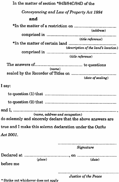 (1) A party to the proceedings on an application who wishes to obtain a statutory declaration may prepare a list of questions to be answered and a requisition in accordance with Form 8.(2) The Recorder must, on payment of the fee prescribed under the Act, seal the requisition.(3) The party wishing to obtain the statutory declaration must serve the sealed requisition on the proposed declarant as if it were a writ of subpoena.(4) A person who is served with a requisition under subregulation (3) must (a) answer the questions set out in the requisition to the best of his or her ability; and(b) verify those answers by statutory declaration; and(c) lodge the answers and declaration in accordance with Form 9.Penalty: Fine not exceeding 20 penalty units.(5) The answers and declaration so lodged may be inspected and copied by any party to the same proceedings free of charge.(6) A person does not commit an offence under subregulation (4)(a) by failing to answer any questions that he or she would not be compelled to answer if they were asked of the person as a witness in the Supreme Court in proceedings based on an application.