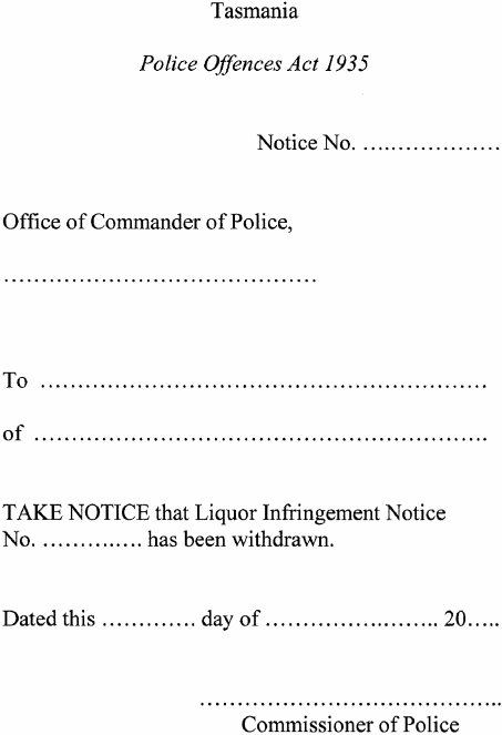 For the purposes of section 62(2) of the Police Offences Act 1935 , a notice withdrawing a liquor infringement notice is to be in accordance with the formin Schedule 1 .