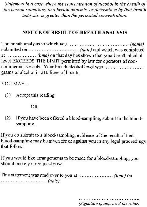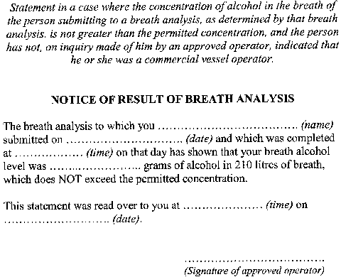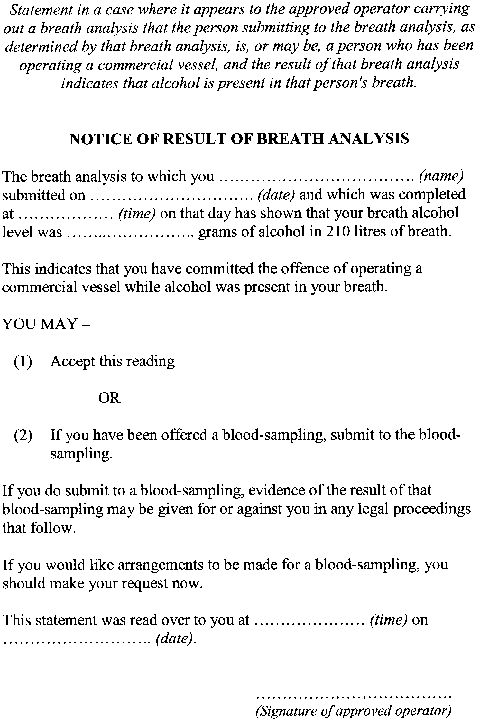 For section 29 of the Act, the written statement is to be in accordance with (a) Form 2 in a case where the concentration of alcohol in the breath of the person submitting to the breath analysis, as determined by the breath analysis, is greater than the permitted concentration; and(b) Form 3 in a case where (i) it appears to the approved operator carrying out the breath analysis that the person submitting to the breath analysis is, or may be, a person who has been operating a commercial vessel; and(ii) the result of the breath analysis indicates that alcohol is present in that person's breath; and(c) Form 4 in a case where (i) the concentration of alcohol in the breath of the person submitting to the breath analysis, as determined by the breath analysis, is not greater than the permitted concentration; and(ii) that person has not, in answer to an inquiry made by an approved operator, indicated that he or she has been operating a commercial vessel.