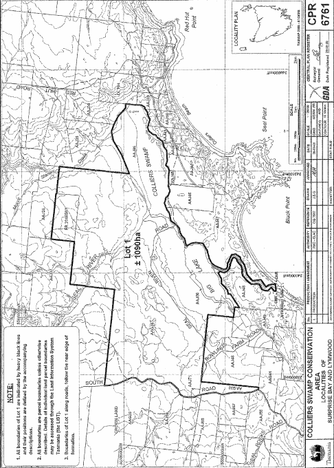 PART 4 - Colliers Swamp Conservation AreaAll that area of land comprising about 1 090 hectares, shown as Lot 1 and bounded by a heavy black line on Plan 6761 in the Central Plan Register, a reduced copy of which is set out, by way of illustration only, in Part 4 of Schedule 2 to this proclamation.