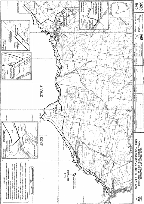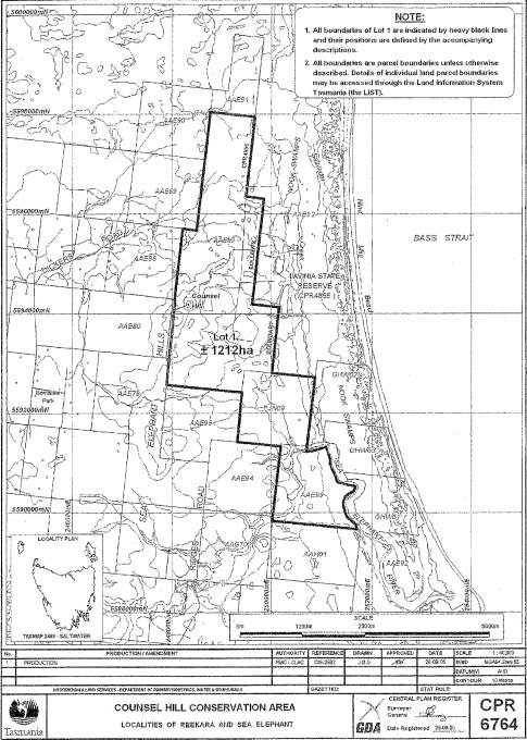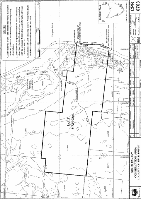 PART 8 - Sea Elephant Conservation AreaAll that area of land comprising about 731.3 hectares, shown as Lot 1 and bounded by a heavy black line on Plan 6763 in the Central Plan Register, a reduced copy of which is set out, by way of illustration only, in Part 8 of Schedule 2 to this proclamation.