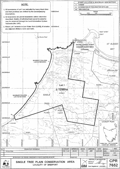 PART 9 - Single Tree Plain Conservation AreaAll that area of land comprising about 1 298 hectares, shown as Lot 1 and bounded by a heavy black line on Plan 7652 in the Central Plan Register, a reduced copy of which is set out, by way of illustration only, in Part 9 of Schedule 2 to this proclamation.