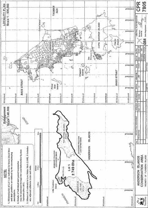 PART 1 - Anderson Islands Conservation AreaAll that area of land comprising about 749.8 hectares, shown as Lot 1 and bounded by a heavy black line on Plan 7805 in the Central Plan Register, a reduced copy of which is set out, by way of illustration only, in Part 1 of Schedule 2 to this proclamation.
