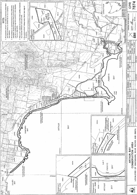 PART 2 - Arthur Bay Conservation AreaAll that area of land comprising about 558.3 hectares, shown as Lot 1 and bounded by a heavy black line on Plan 7874 in the Central Plan Register, a reduced copy of which is set out, by way of illustration only, in Part 2 of Schedule 2 to this proclamation.