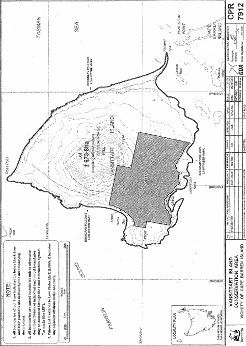 PART 10 - Vansittart Island Conservation AreaAll that area of land comprising about 673.8 hectares, shown as Lot 1 (not including the hatched portion) and bounded by a heavy black line on Plan 7912 in the Central Plan Register, a reduced copy of which is set out, by way of illustration only, in Part 10 of Schedule 2 to this proclamation.