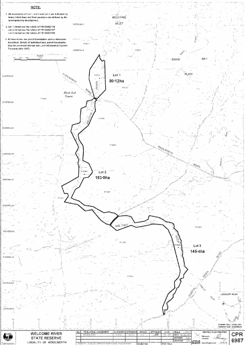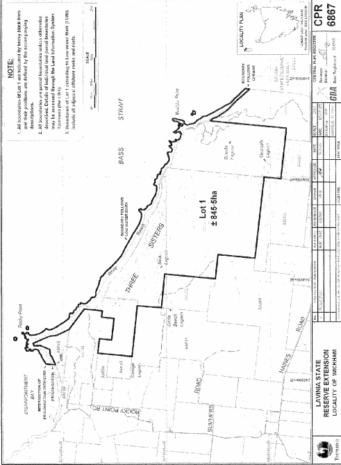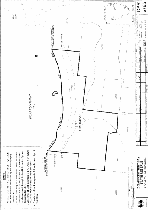 PART 2 - Disappointment Bay State ReserveAll that area of land comprising about 69.04 hectares, shown as Lot 1 and bounded by a heavy black line, on Plan 6765 in the Central Plan Register, a reduced copy of which is set out, by way of illustration only, in Part 2 of Schedule 2 to this proclamation.