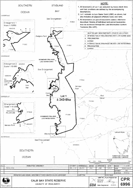 PART 1 - Calm Bay State ReserveAll that area of land comprising about 343.8 hectares, shown as Lot 1 and bounded by a heavy black line, on Plan 6996 in the Central Plan Register, a reduced copy of which is set out, by way of illustration only, in Part 1 of Schedule 2 to this proclamation.