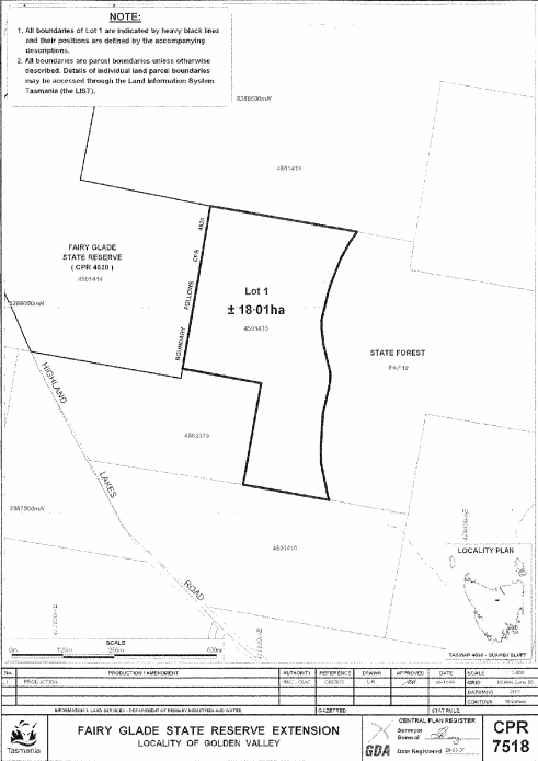 PART 6 - Fairy Glade State ReserveAll that area of land comprising about 18.01 hectares, shown as Lot 1 and bounded by a heavy black line, on Plan 7518 in the Central Plan Register, a reduced copy of which is set out, by way of illustration only, in Part 6 of Schedule 2 to this proclamation.