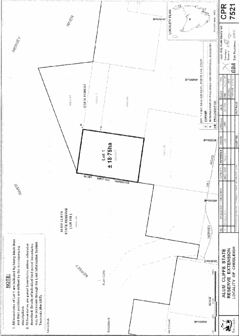 PART 5 - Alum Cliffs State ReserveAll that area of land comprising about 18.75 hectares, shown as Lot 1 and bounded by a heavy black line, on Plan 7521 in the Central Plan Register, a reduced copy of which is set out, by way of illustration only, in Part 5 of Schedule 2 to this proclamation.
