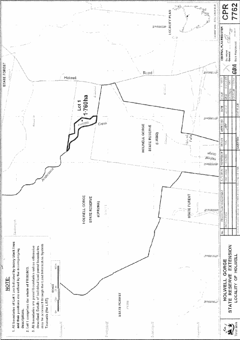 PART 7 - Holwell Gorge State ReserveAll that area of land comprising about 1.76 hectares, shown as Lot 1 and bounded by a heavy black line, on Plan 7762 in the Central Plan Register, a reduced copy of which is set out, by way of illustration only, in Part 7 of Schedule 2 to this proclamation.