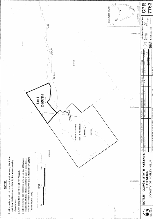 PART 10 - Notley Gorge State ReserveAll that area of land comprising about 2.697 hectares, shown as Lot 1 and bounded by a heavy black line, on Plan 7763 in the Central Plan Register, a reduced copy of which is set out, by way of illustration only, in Part 10 of Schedule 2 to this proclamation.