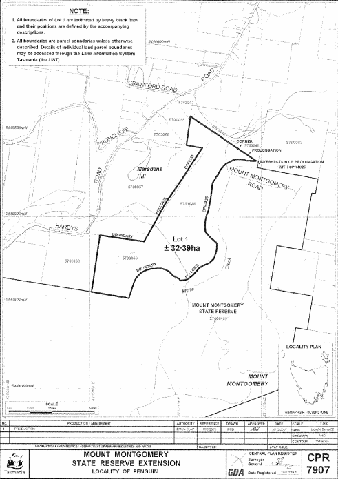 PART 9 - Mount Montgomery State ReserveAll that area of land comprising about 32.39 hectares, shown as Lot 1 and bounded by a heavy black line, on Plan 7907 in the Central Plan Register, a reduced copy of which is set out, by way of illustration only, in Part 9 of Schedule 2 to this proclamation.