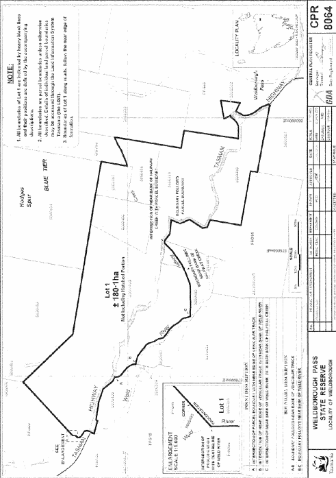 PART 4 - Weldborough Pass State ReserveAll that area of land comprising about 180.1 hectares, shown as Lot 1 (not including the hatched portion) and bounded by a heavy black line, on Plan 8064 in the Central Plan Register, a reduced copy of which is set out, by way of illustration only, in Part 4 of Schedule 2 to this proclamation.