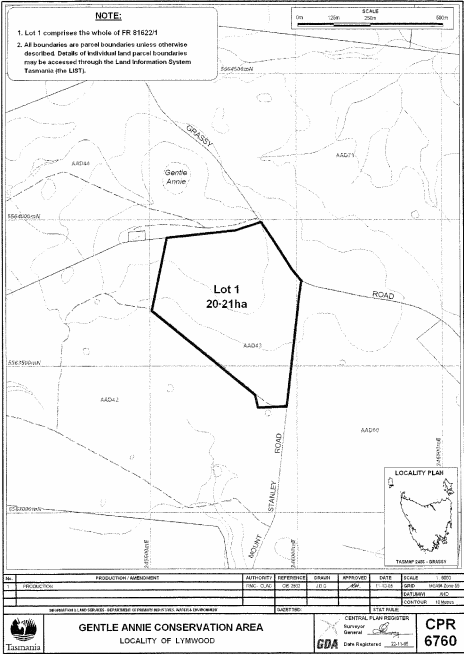 PART 9 - Gentle Annie Conservation AreaAll that area of land comprising about 20.21 hectares, shown as Lot 1 and bounded by a heavy black line on Plan 6760 in the Central Plan Register, a reduced copy of which is set out, by way of illustration only, in Part 9 of Schedule 2 to this proclamation.