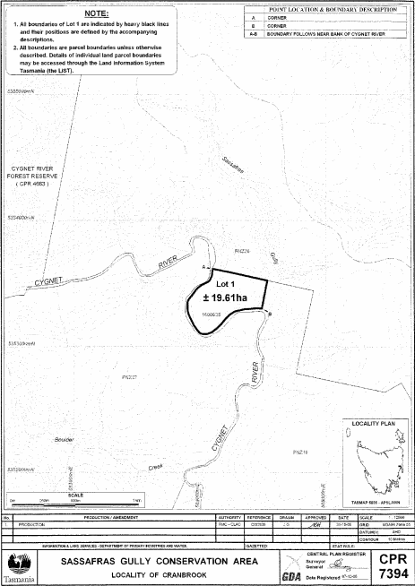 PART 14 - Sassafras Gully Conservation AreaAll that area of land comprising about 19.61 hectares, shown as Lot 1 and bounded by a heavy black line on Plan 7394 in the Central Plan Register, a reduced copy of which is set out, by way of illustration only, in Part 14 of Schedule 2 to this proclamation.