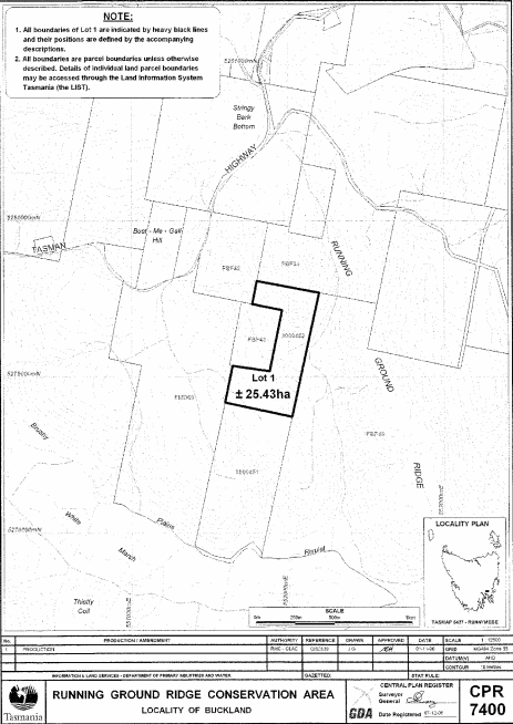 PART 13 - Running Ground Ridge Conservation AreaAll that area of land comprising about 25.43 hectares, shown as Lot 1 and bounded by a heavy black line on Plan 7400 in the Central Plan Register, a reduced copy of which is set out, by way of illustration only, in Part 13 of Schedule 2 to this proclamation.