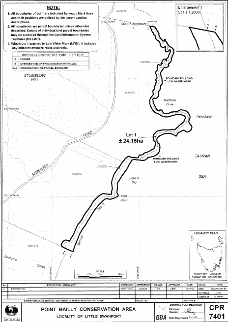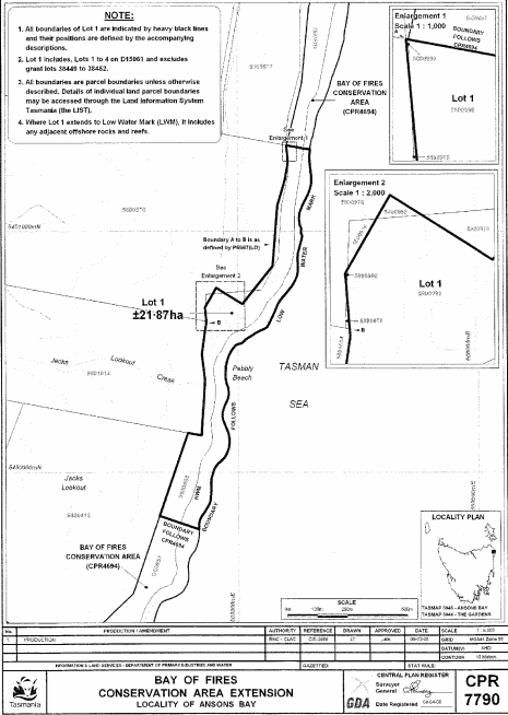 PART 1 - Bay of Fires (First Extension)All that area of land comprising about 21.87 hectares, shown as Lot 1 and bounded by a heavy black line on Plan 7790 in the Central Plan Register, a reduced copy of which is set out, by way of illustration only, in Part 1 of Schedule 2 to this proclamation.