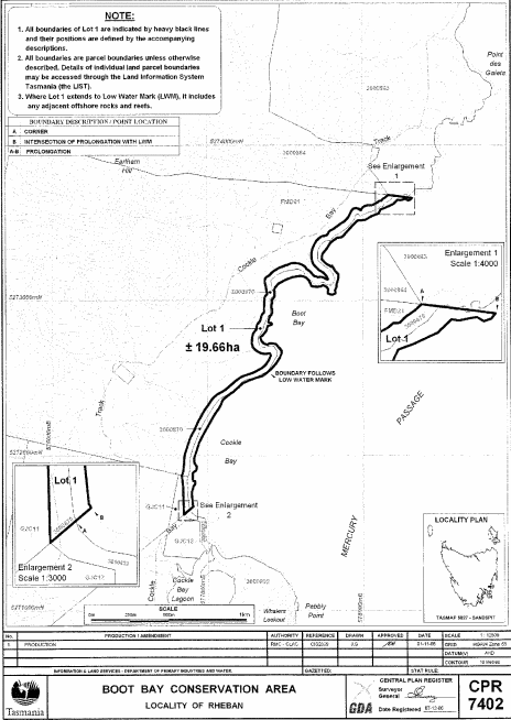 PART 8 - Boot Bay Conservation AreaAll that area of land comprising about 19.66 hectares, shown as Lot 1 and bounded by a heavy black line on Plan 7402 in the Central Plan Register, a reduced copy of which is set out, by way of illustration only, in Part 8 of Schedule 2 to this proclamation.
