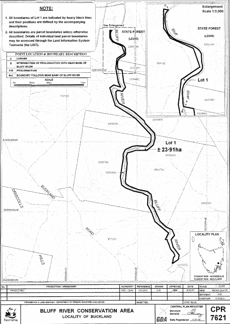 PART 7 - Bluff River Conservation AreaAll that area of land comprising about 23.91 hectares, shown as Lot 1 and bounded by a heavy black line on Plan 7621 in the Central Plan Register, a reduced copy of which is set out, by way of illustration only, in Part 7 of Schedule 2 to this proclamation.