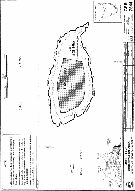 PART 10 - Ninth Island Conservation AreaAll that area of land comprising about 26.45 hectares, shown as Lot 1 (excluding the hatched portion) and bounded by a heavy black line on Plan 7644 in the Central Plan Register, a reduced copy of which is set out, by way of illustration only, in Part 10 of Schedule 2 to this proclamation.