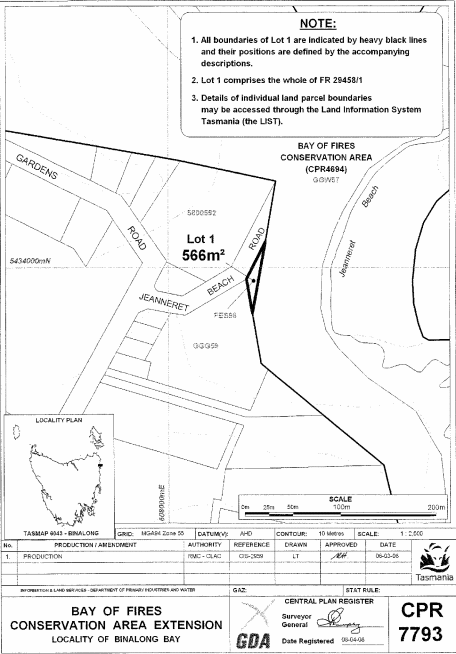 PART 2 - Bay of Fires (Second Extension)All that area of land comprising about 566 square metres, shown as Lot 1 and bounded by a heavy black line on Plan 7793 in the Central Plan Register, a reduced copy of which is set out, by way of illustration only, in Part 2 of Schedule 2 to this proclamation.