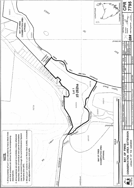 PART 3 - Bay of Fires (Third Extension)All that area of land comprising about 5.262 hectares, shown as Lot 1 and bounded by a heavy black line on Plan 7795 in the Central Plan Register, a reduced copy of which is set out, by way of illustration only, in Part 3 of Schedule 2 to this proclamation.