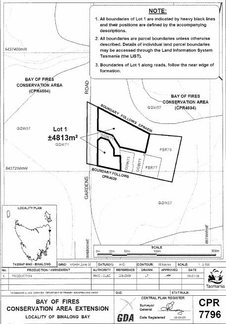 PART 4 - Bay of Fires (Fourth Extension)All that area of land comprising about 4 813 square metres, shown as Lot 1 (in 2 parts) and bounded by heavy black lines on Plan 7796 in the Central Plan Register, a reduced copy of which is set out, by way of illustration only, in Part 4 of Schedule 2 to this proclamation.