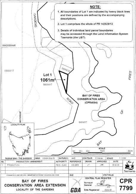 PART 5 - Bay of Fires (Fifth Extension)All that area of land comprising about 1 061 square metres, shown as Lot 1 and bounded by a heavy black line on Plan 7799 in the Central Plan Register, a reduced copy of which is set out, by way of illustration only, in Part 5 of Schedule 2 to this proclamation.