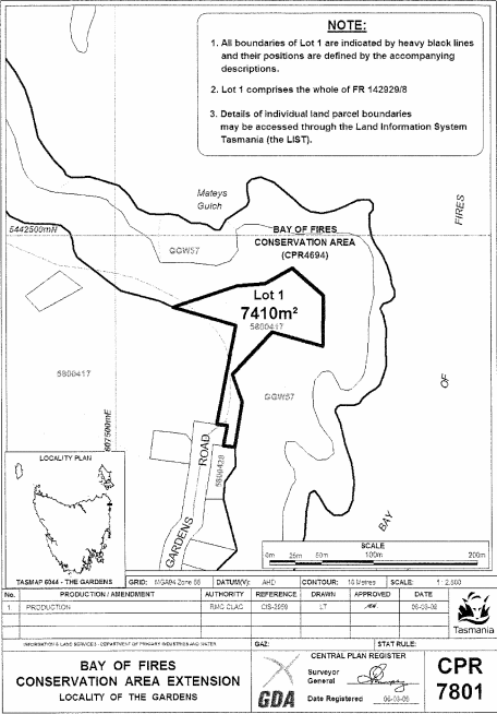 PART 6 - Bay of Fires (Sixth Extension)All that area of land comprising about 7 410 square metres, shown as Lot 1 and bounded by a heavy black line on Plan 7801 in the Central Plan Register, a reduced copy of which is set out, by way of illustration only, in Part 6 of Schedule 2 to this proclamation.