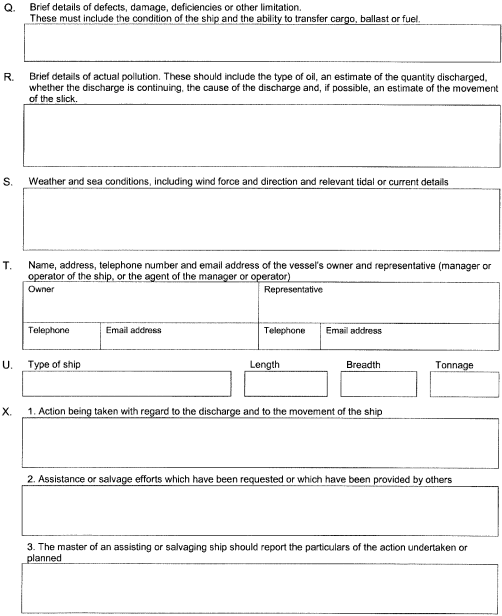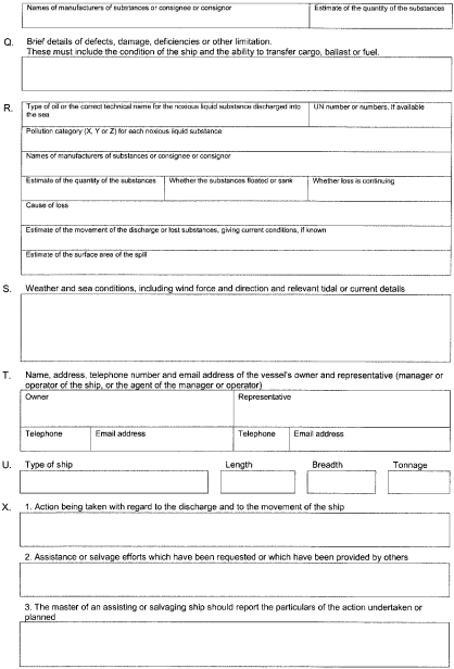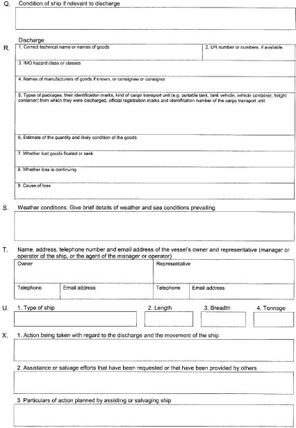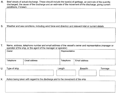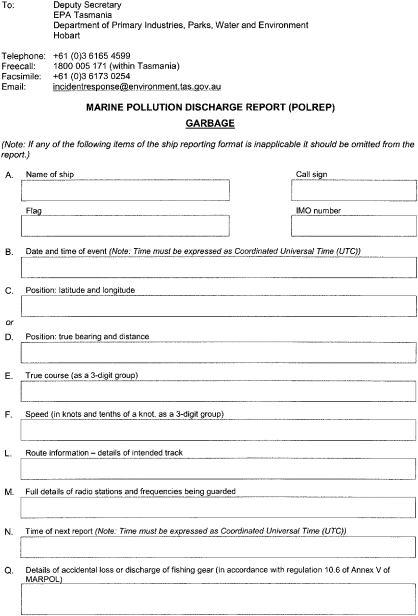 For the purposes of sections 25I(6) and (7) of the Act (a) the prescribed form for a requested report of an incident in relation to a ship is (iv) Form 1, if the incident relates to the discharge, or probable discharge, from the ship of oil or an oily mixture contrary to section 8(1) of the Act, other than a discharge to which section 8(6) of the Act applies; and(v) Form 2, if the incident relates to the discharge, or probable discharge, from the ship of a noxious liquid substance, or a mixture containing a noxious liquid substance, carried as cargo or part cargo in bulk contrary to section 20(1) of the Act, other than a discharge to which section 20(4) , (5) , (6) , (7) , (8) , (9) , (10) , (11) or (12) of the Act applies; and(vi) Form 3, if the incident relates to the jettisoning, or probable jettisoning, from the ship of a harmful substance carried as cargo in packaged form contrary to section 25C(1) of the Act; and(vii) Form 4, if the incident relates to the disposal, or probable disposal, of garbage from the ship contrary to section 25F(1) of the Act; and(b) the prescribed time within which that report must be furnished to a prescribed officer is within 24 hours immediately after the receipt of the request for the report from the prescribed officer.