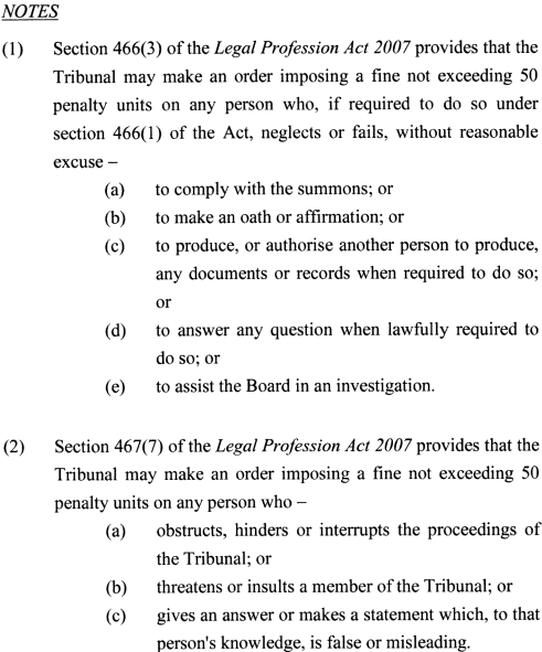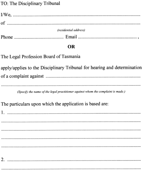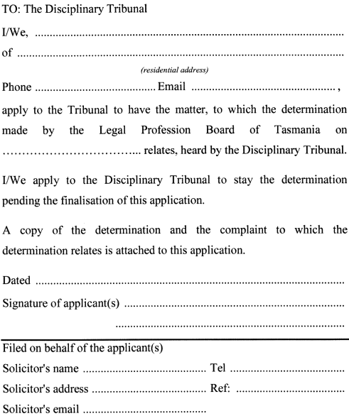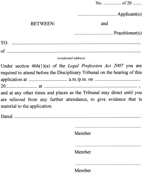 In these rules Act means the Legal Profession Act 2007 ;application means (a) an application to the Tribunal, under section 458 of the Act, in respect of a determination; or(b) an application to the Tribunal, under section 464(1) of the Act, for the hearing and determination of a complaint; or(c) a referral to the Tribunal, under section 464(2) of the Act, with a recommendation that the Tribunal make a compensation order;notice of hearing means a notice served by the Tribunal under section 467(1) of the Act in respect of an application;relevant party means (a) in relation to an application under section 458 of the Act, the complainant or the practitioner against whom the complainant has made the complaint; and(b) in relation to an application under section 464 of the Act, the applicant or the respondent;Secretary means the secretary to the Tribunal appointed under section 616 of the Act.
