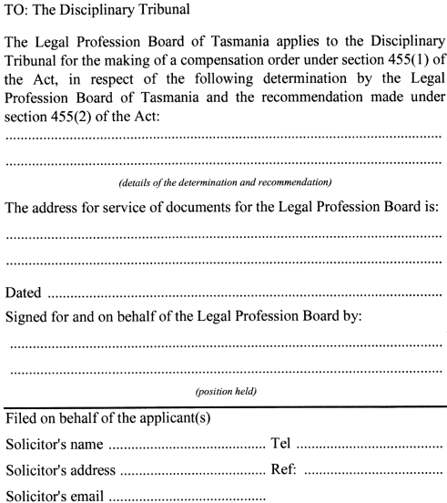 (1) An application to the Tribunal, under section 458 of the Act, in respect of a determination is to be in accordance with Form 1 in Schedule 1 .(2) An application to the Tribunal, under section 464(1) of the Act, to hear and determine a complaint is to be in accordance with Form 2 in Schedule 1 .(3) A referral to the Tribunal, under section 464(2) of the Act, with a recommendation that the Tribunal make a compensation order is to be in accordance with Form 3 in Schedule 1 .