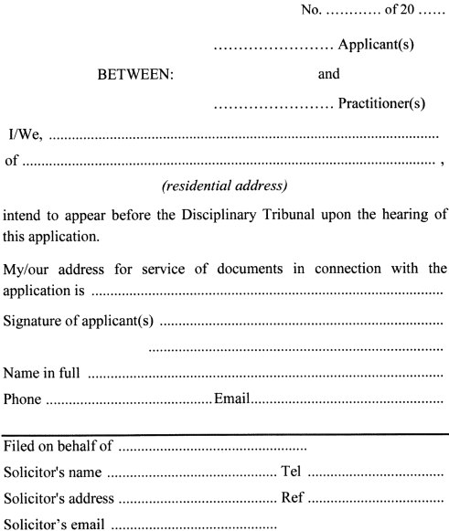 (1) A person who is served with a copy of an application and intends to take part in the proceedings to which the application relates is to lodge with the Secretary a notice of address for service within 8 days of being served with the copy of the application.(2) For the purposes of subrule (1) , the notice of address for service is to be in accordance with Form 4 in Schedule 1 .