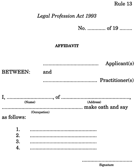 An affidavit is to be (a) in accordance with Form 6 in Schedule 1 ; and(b) sworn before any of the following:(i) a judge of the Supreme Court;(ii) the Master, Registrar or Deputy Registrar of the Supreme Court;(iii) a district registrar of the Supreme Court;(iv) a commissioner of the Supreme Court to administer oaths;(v) a magistrate;(vi) a justice.