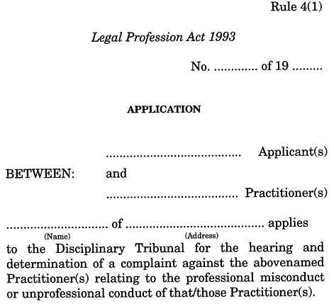 In these rules Act means the Legal Profession Act 1993 ;application means an application to hear and determine a complaint under section 72 of the Act;approved document exchange means an approved document exchange as defined in the Supreme Court Rules;notice of hearing means a notice served under section 72(5) of the Act;practitioner means a practitioner as defined in section 56 of the Act;Secretary means the Secretary to the Tribunal appointed under section 70 of the Act.