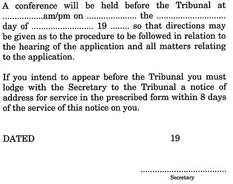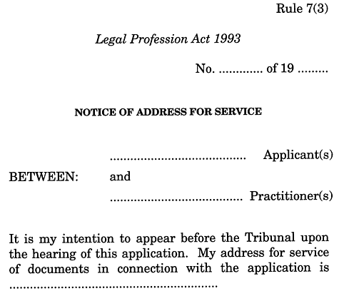 (1) A person who is served with a notice of hearing and intends to appear before the Tribunal at the hearing of the application is to lodge with the Secretary a notice of address for service.(2) The person is to lodge the notice of address for service within 8 days of being served with the notice of hearing.(3) The notice of address for service is to be in accordance with Form 3 in Schedule 1 .