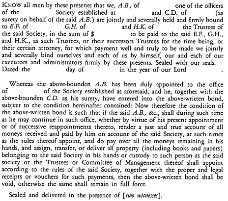 [Section 17 Amended by 25 Geo. V No. 78 ]With respect to officers of registered societies or branches having the receipt or charge of money, the following provisions shall have effect:(a) every officer shall before taking upon himself the execution of his office become bound with one sufficient surety at the least in a bond, which may be in the Form 4 in Schedule 1 , or the security of a guarantee society in such sum as the society or branch may direct, conditioned for his rendering a just and true account of all moneys received and paid by him on account of the society or branch at such times as its rules appoint, or as the society or branch or the trustees or committee of management thereof require him to do, and for the payment by him of all sums due from him to the society or branch;(b) every officer, his executors or administrators, shall at such times as by the rules of the society or branch he should render account, or upon demand made, or upon notice in writing given or left at his last or usual place of residence, give in his account as may be required by the society or branch or by the trustees or committee of management thereof, to be examined and allowed or disallowed by them, and shall on the like demand or notice pay over all moneys and deliver all property for the time being in his hands or custody to such person as the society or branch, or the committee of management, or the trustees appoint; and in case of any neglect or refusal to deliver such account, or to pay over such moneys, or to deliver such property in manner aforesaid, the trustees or authorized officers of the society or branch may sue upon the bond or security before mentioned, or may apply to a judge in chambers, or to any 2 justices; and the order of such judge or justices shall be final and conclusive.