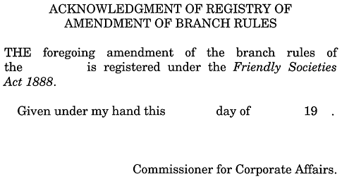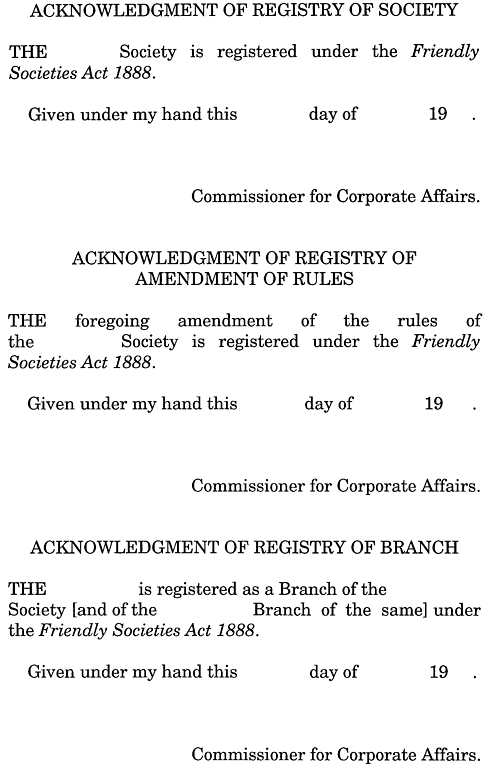 The acknowledgment of registry of a society or a branch and of any amendment of the rules thereof respectively shall be in the forms provided in the Form 5 in Schedule 1 .