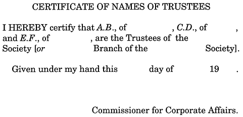 [Section 38 Amended by No. 9 of 1982, s. 7 and Sched. 10 ]A certificate in the Form 6 in Schedule 1 in writing, under the hand of the Commissioner, of the names of the trustees of any society or branch, shall, until the contrary is proved, be evidence that the persons named therein are the trustees of such society or branch.[Section 39 Repealed by 25 Geo. V No. 78 ]
