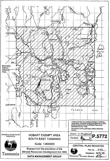 SCHEDULE 1 - Exempt areaAll that area of land in the land districts of Cumberland, Somerset, Monmouth, Pembroke, Arthur, Buckingham and Kent comprising about 1 110 square kilometres shown bounded by a heavy black line on Plan No. 4142 in the Central Plan Register, a reduced copy of which is set out, by way of illustration only, in Schedule 2 to this order.