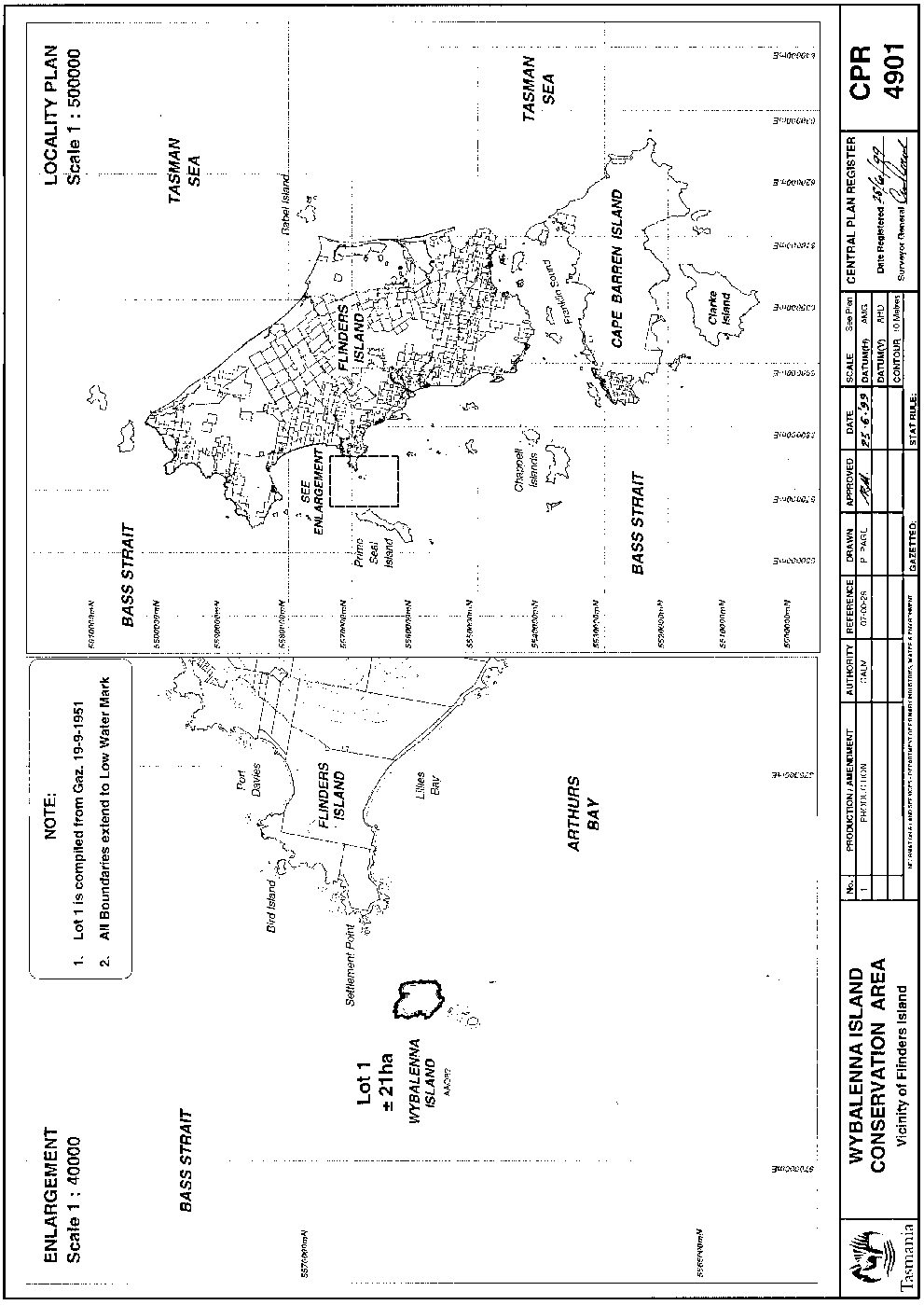 SCHEDULE 1 - Wybalenna Island Conservation AreaAll that area of land comprising about 21 hectares shown bounded by a heavy black line on Plan Number 4901 in the Central Plan Register, a reduced copy of which is set out, by way of illustration only, in Schedule 2 to this proclamation.